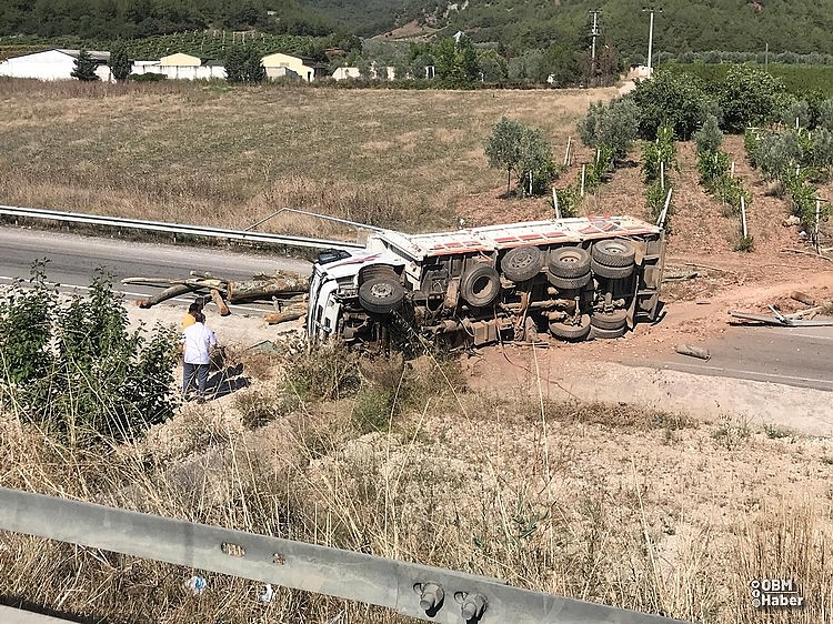 Freni boşalan tomruk yüklü kamyon devrildi